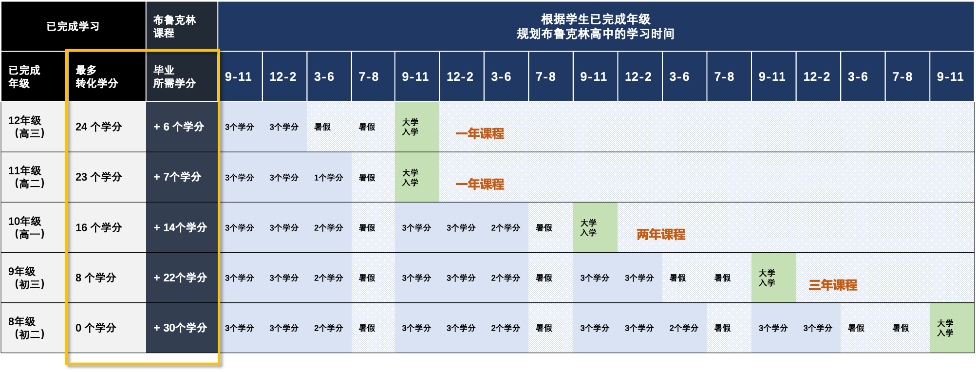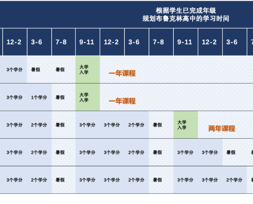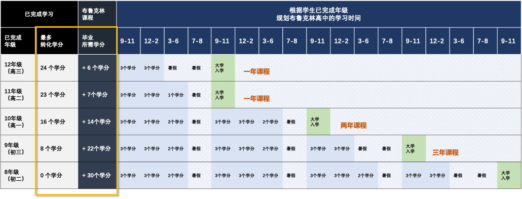 任何年级的学生都可以参加OSSD课程的学习。为了满足全球不同教育体系的学生的需求,学生可以在一年中任何一个开学时间入学。一年有五次入学时间,分别是9月,12月,3月,7月和8月。学生可以灵活规划学分和学习时间,缩短他们的毕业时间。学校建议每年修读 8-10 个学分。